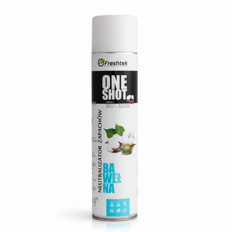 „One Shot” Bawełna marki Freshtek, o zapachu bawełny, to środek o podwójnym działaniu – odświeżacza powietrza i neutralizatora nieprzyjemnych zapachów.