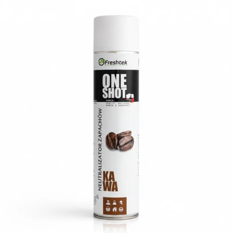 „One Shot” Kawa marki Freshtek, o zapachu kawy, to środek o podwójnym działaniu – odświeżacza powietrza i neutralizatora nieprzyjemnych zapachów.