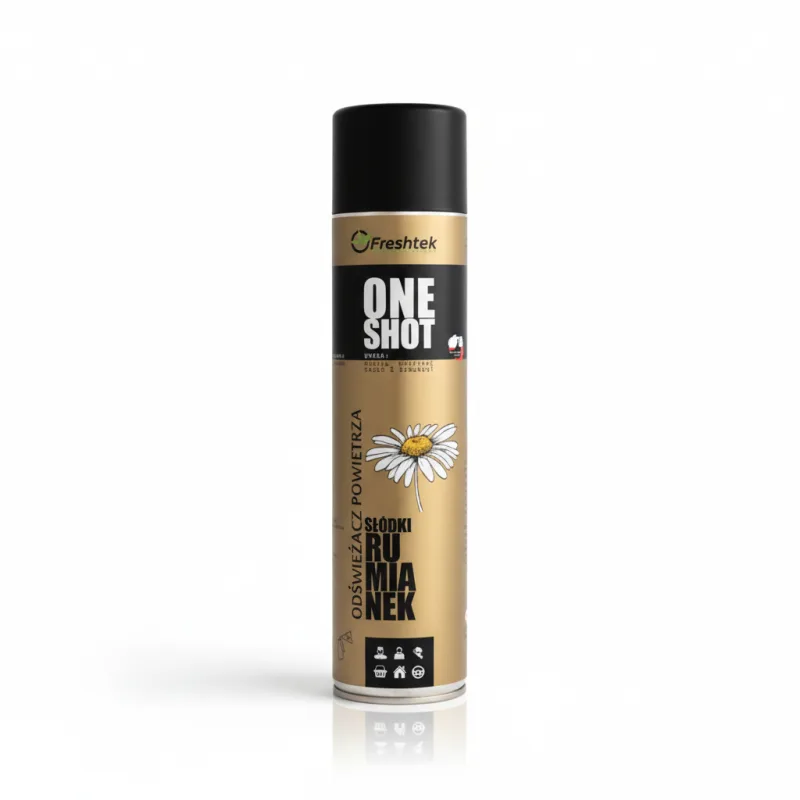 „One Shot” Słodki Rumianek marki Freshtek, o zapachu słodkiego rumianku, to perfumowany odświeżacz powietrza.
