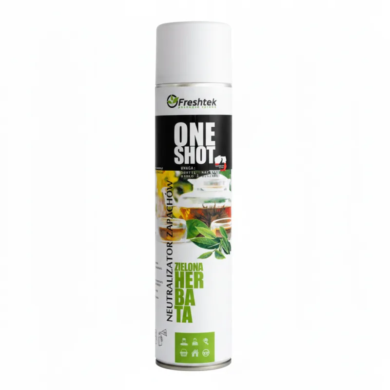 „One Shot” Zielona Herbata marki Freshtek, o zapachu zielonej herbaty, to środek o podwójnym działaniu – odświeżacza powietrza i neutralizatora nieprzyjemnych zapachów.