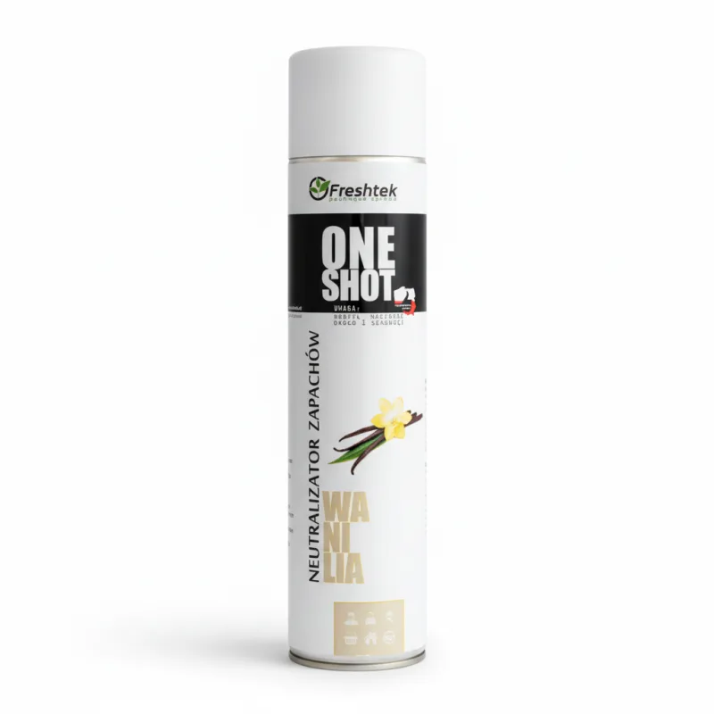 „One Shot” Wanilia marki Freshtek, o zapachu wanilii, to środek o podwójnym działaniu – odświeżacza powietrza i neutralizatora nieprzyjemnych zapachów.